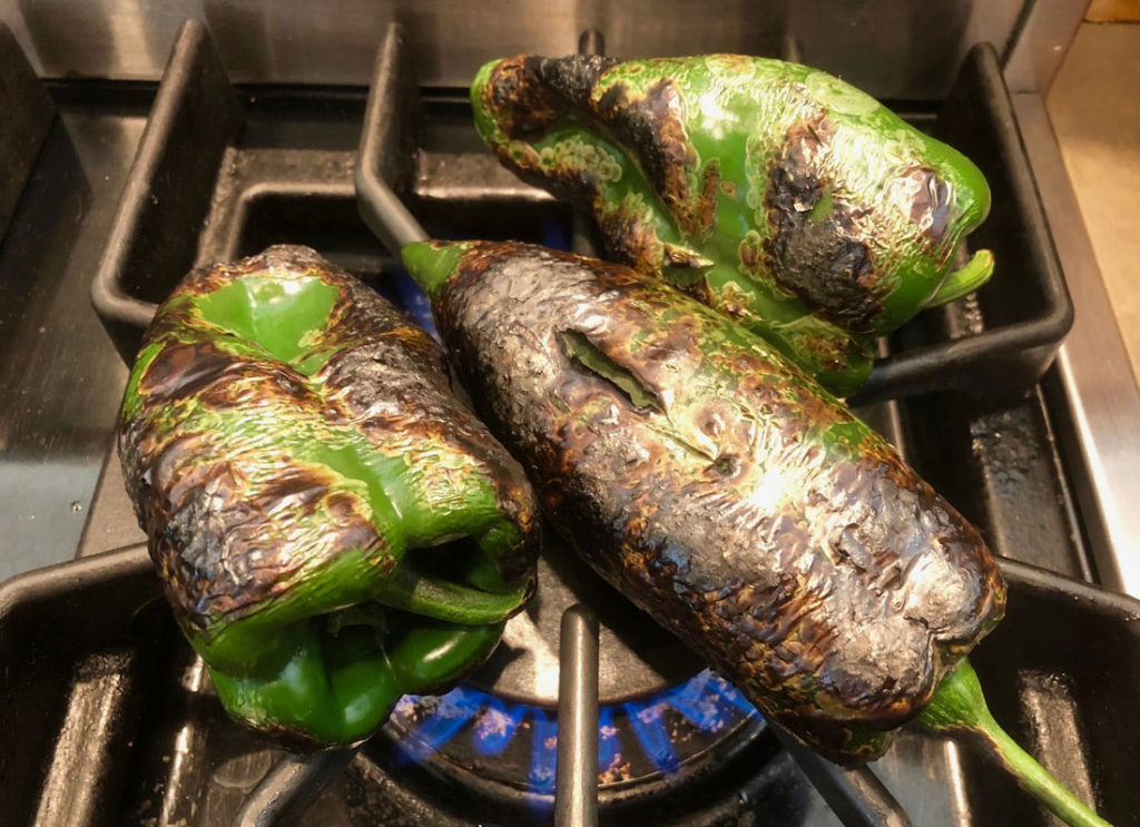 To Roast the Poblano Chiles: To remove the skins from poblano chiles, place them over a gas flame on the stove top or grill (pictured), or under a broiler, turning frequently until they are completely charred. Place them in a bowl and cover with plastic wrap. Allow them to steam for 10 – 15 minutes to loosen the skins. Remove the blackened skins with the fingers, and open to remove the seeds, pod and stem. The flesh can them be chopped to add to the recipe.